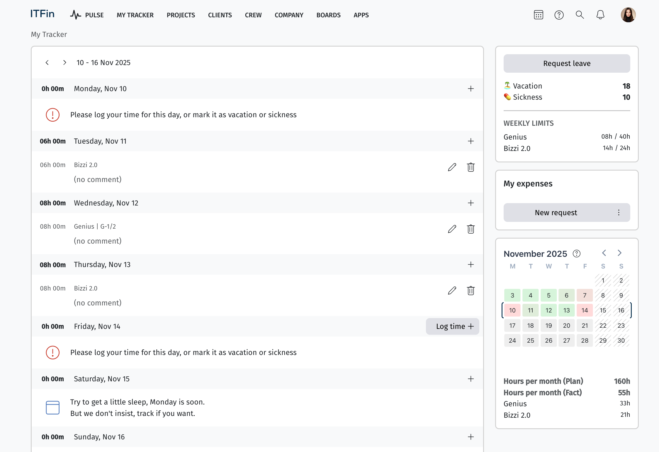 Using the tracker, each employee will have the ability to log time manually in the ITFi system. Logging is typically restricted by time frames but can be unlimited with special access.