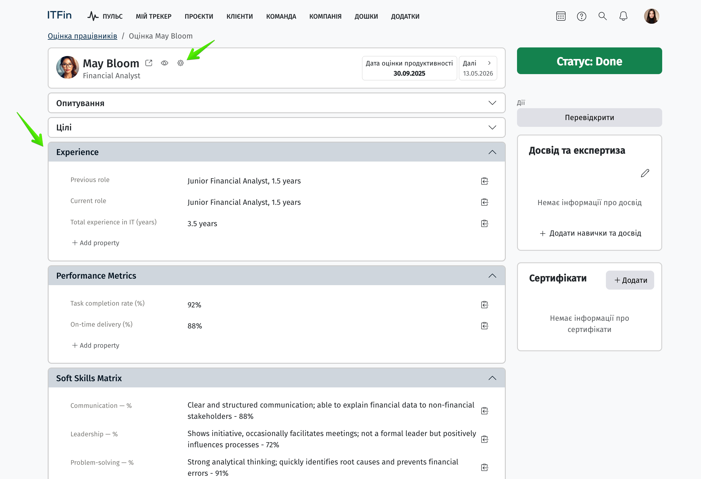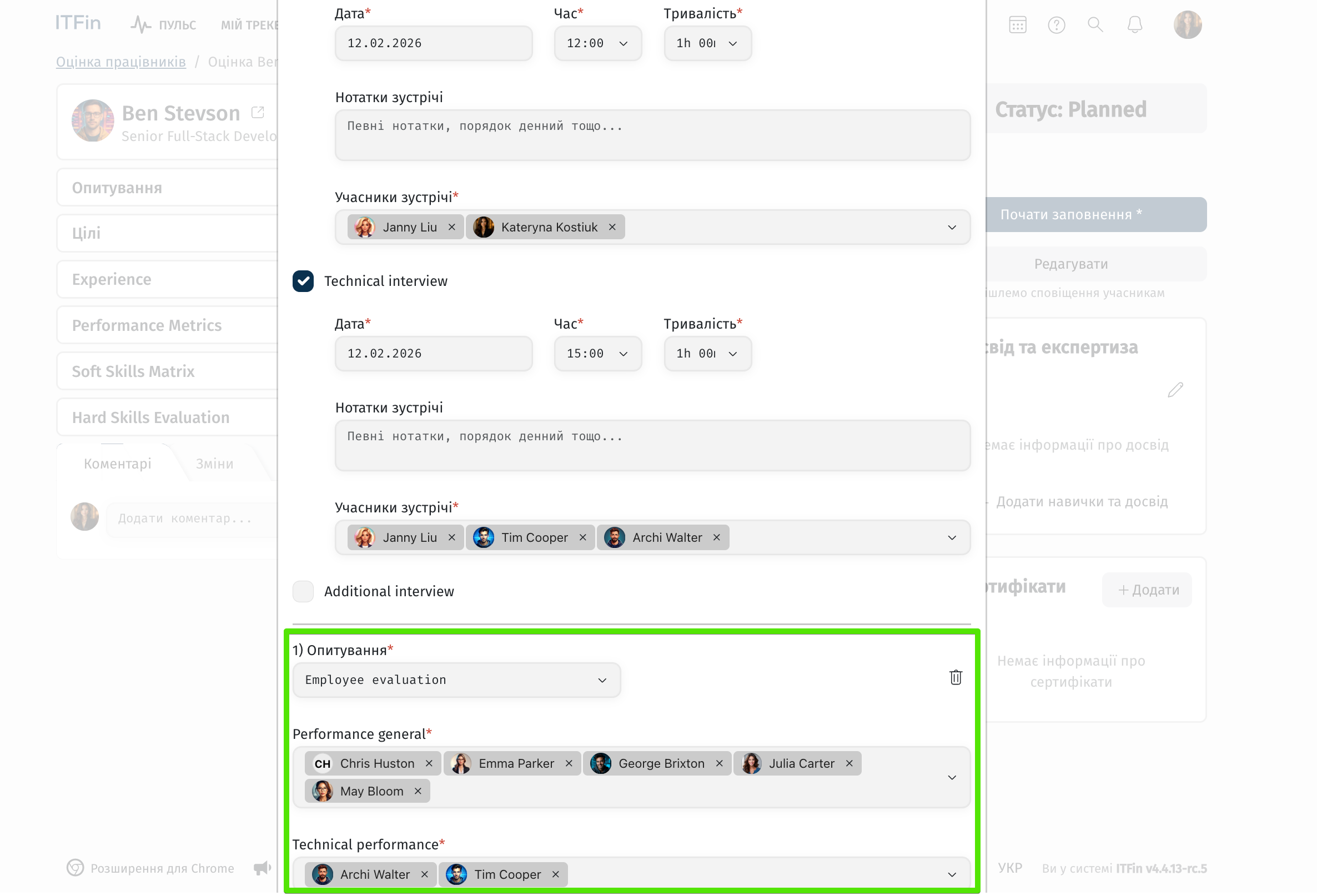 На сторінці Оцінка працівників доступна функція створення кастомних секцій для зберігання додаткових важливих даних про працівника.