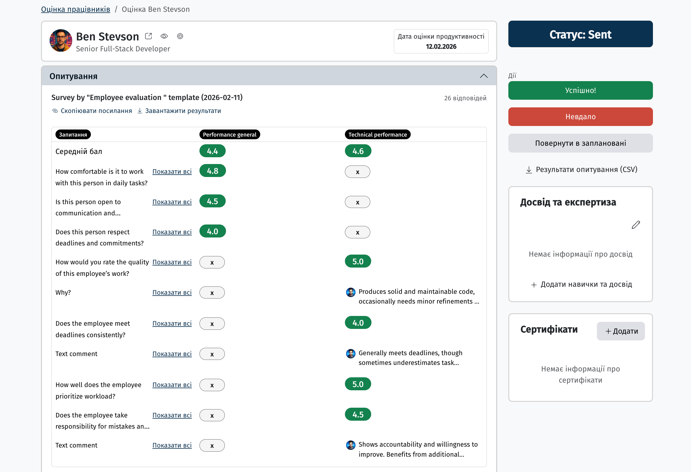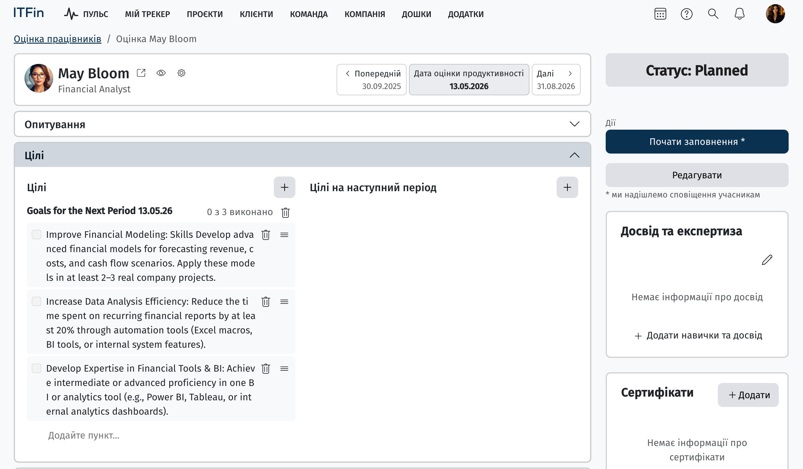 Система не анулює записи про оцінки продуктивності автоматично після звільнення. Якщо для звільненого працівника залишилися активні заплановані оцінки тощо, їх необхідно закрити вручну — скасувати або видалити (за наявності відповідних прав доступу).