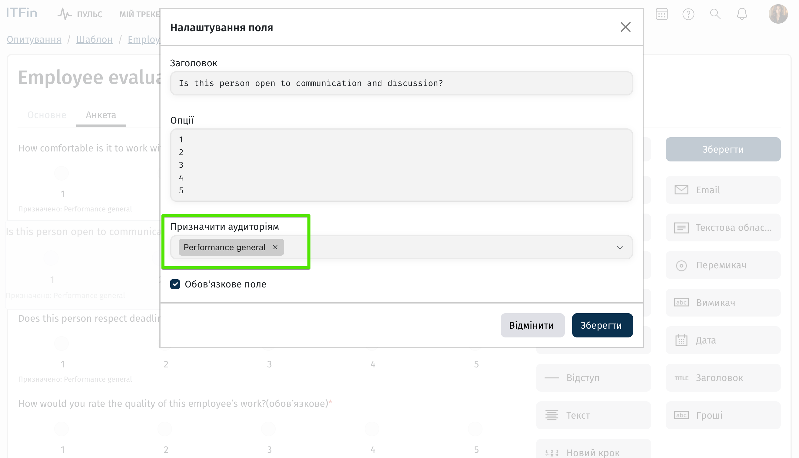 Під час додавання питань на вкладці Анкета необхідно обрати аудиторію, для якої буде відображатися конкретне запитання.