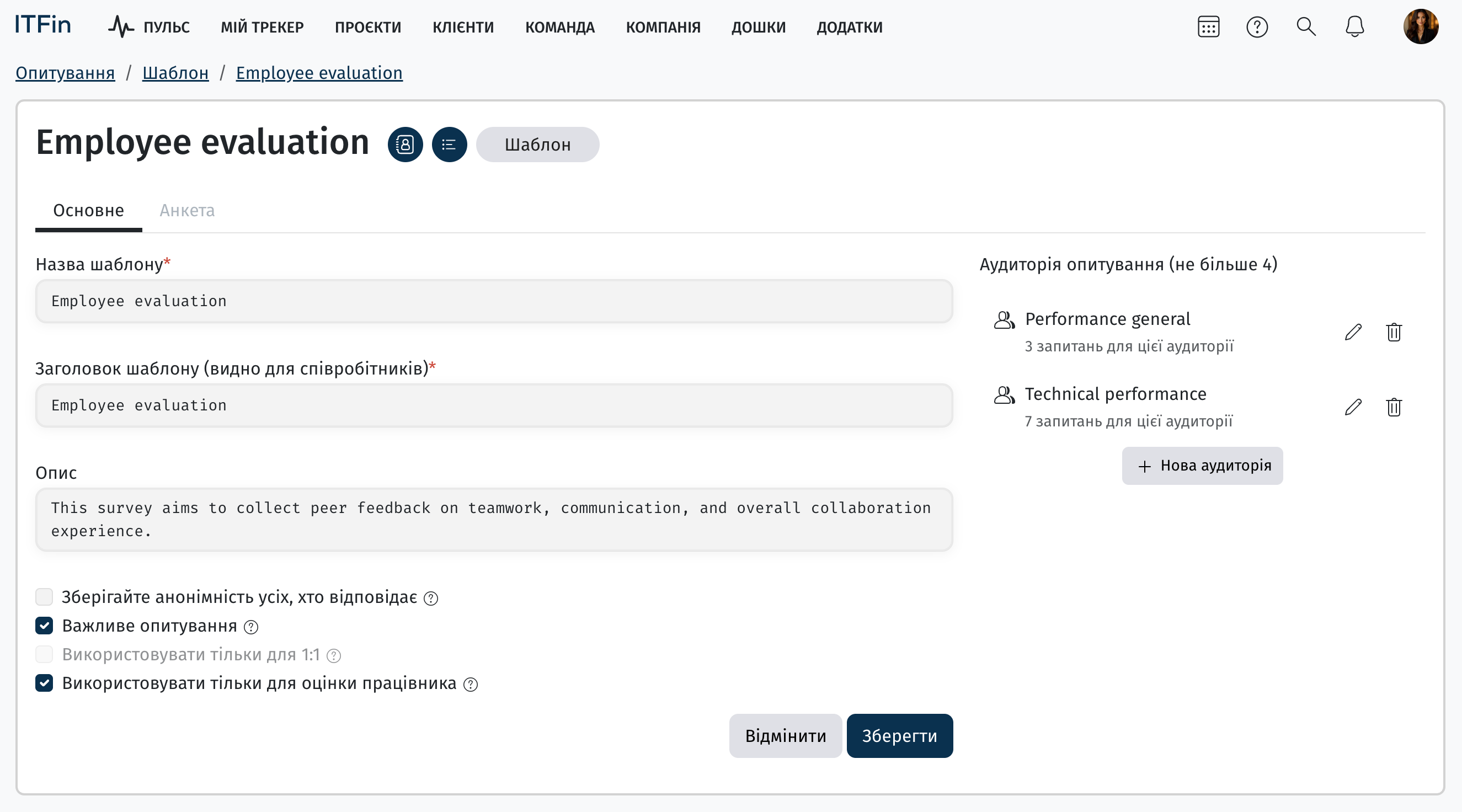 Необхідно обрати опитування зі списку шаблонів та призначити працівників до відповідних аудиторій, які були попередньо налаштовані в самому опитуванні.