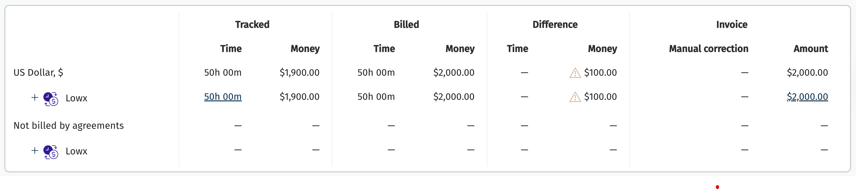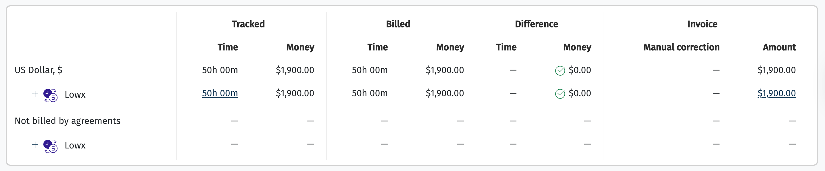 • Billed — години та сума, виставлені в інвойсі (визначаються по періоду інвойсування).